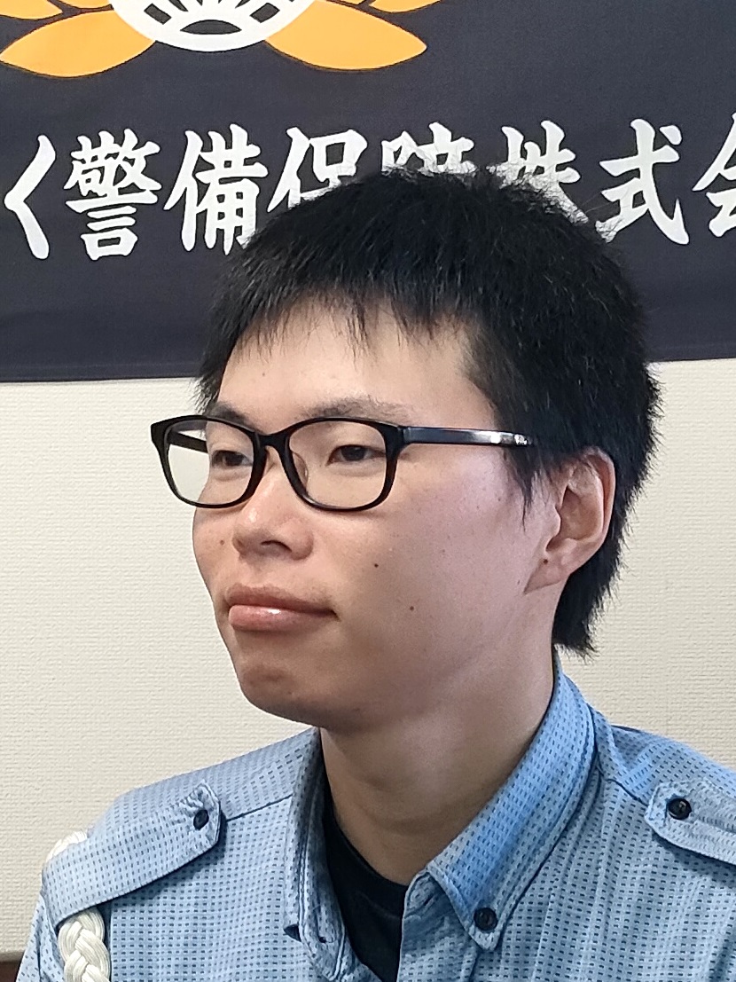 - 交通誘導警備、イベント警備の現場で主に隊長をしています。お客様の求める事故や苦情のない現場を作り上げるため、わかりやすい誘導と元気な挨拶を心がけています。
